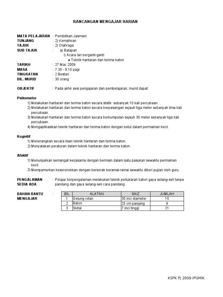 Rancangan Pengajaran Harian Pj Olahraga Lari Berganti Ganti Pdf